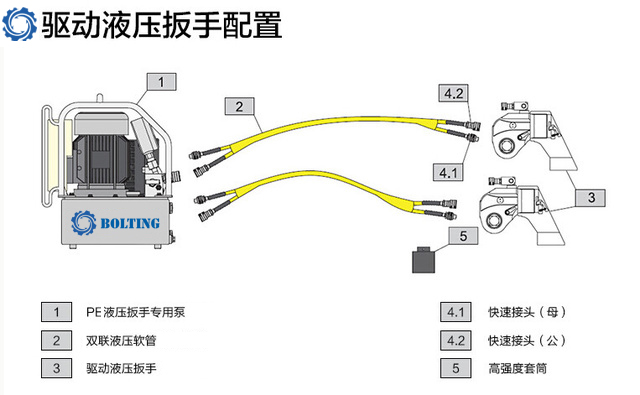 液壓扳手專用泵是液壓扳手的動(dòng)力單元.。液壓扳手專用泵屬于高壓泵,最高工作壓力一般為70MPa,常見(jiàn)的有電動(dòng)液壓泵和氣動(dòng)液壓泵。如下液壓扳手配置圖: