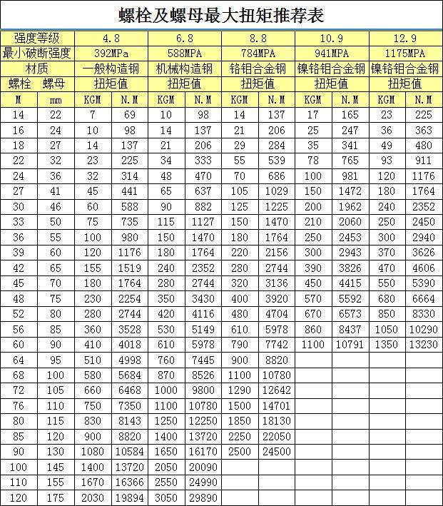 力矩?fù)Q算其實(shí)就是螺栓螺母扭矩值推薦表,通過(guò)這張表我們能夠查詢(xún)出螺栓螺母強(qiáng)度等級(jí)、材質(zhì)和螺栓大小扭矩值,通過(guò)這些數(shù)據(jù)我們也能更好的選型,知道自己的工況適合哪一種液壓扳手。其實(shí)如果你看不懂這張表,不知道中空式扳手力矩值換算怎么弄,也沒(méi)關(guān)系,畢竟現(xiàn)在很多液壓扳手品牌商家都會(huì)為你進(jìn)行售前選型。